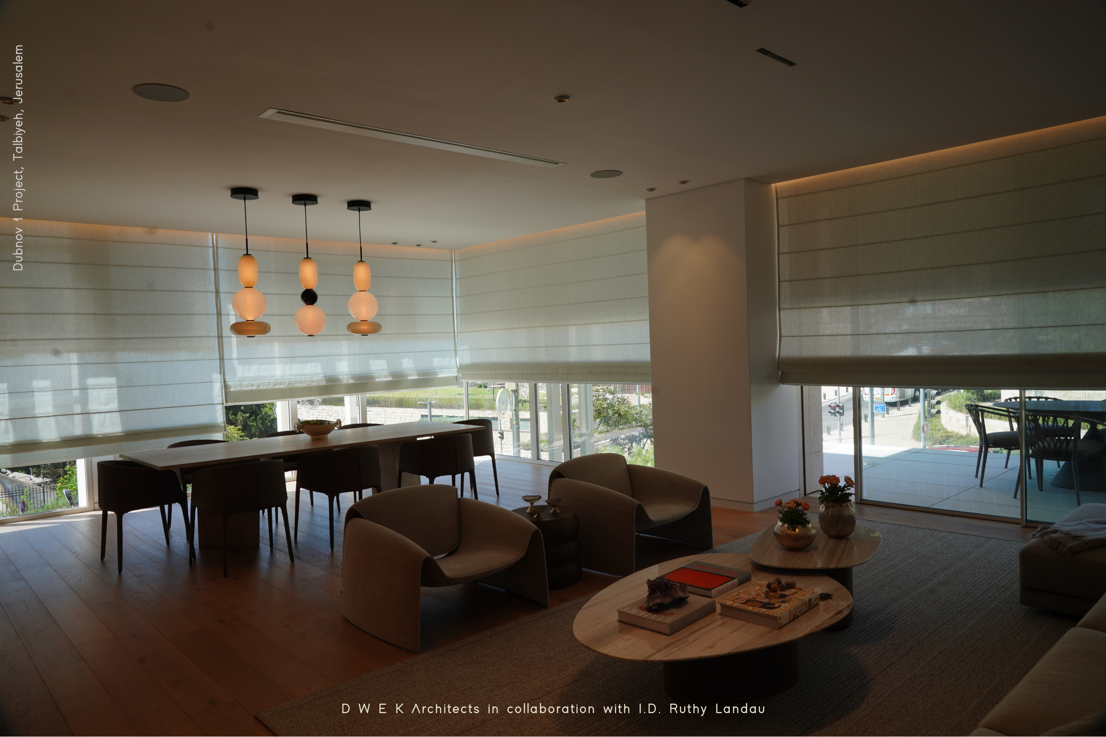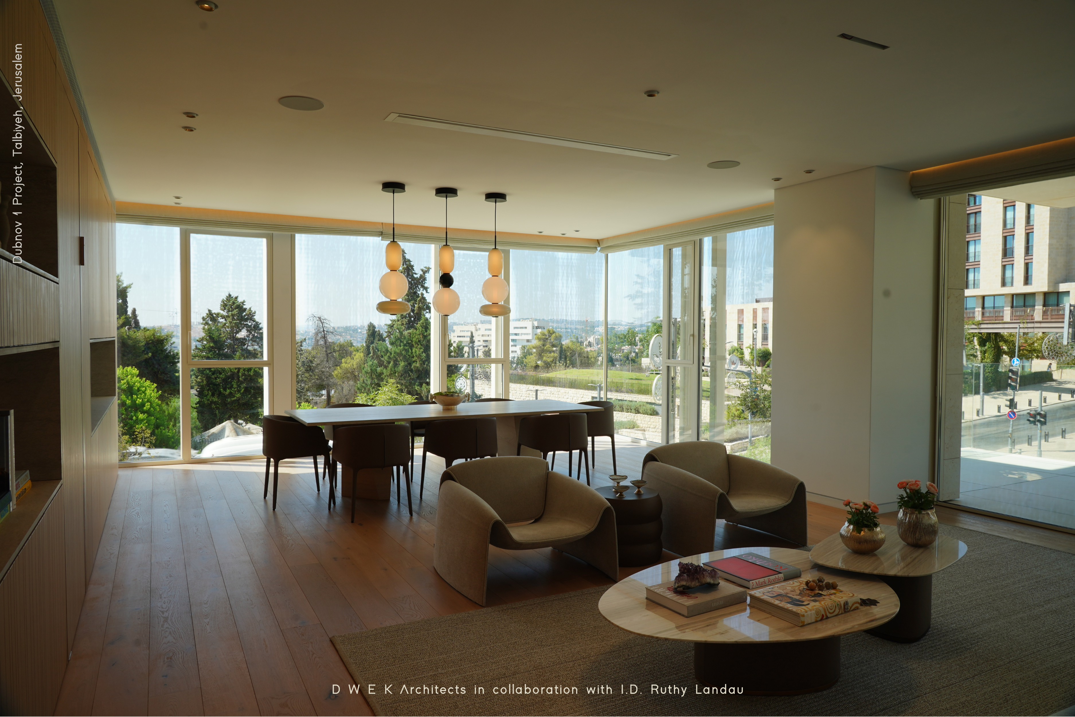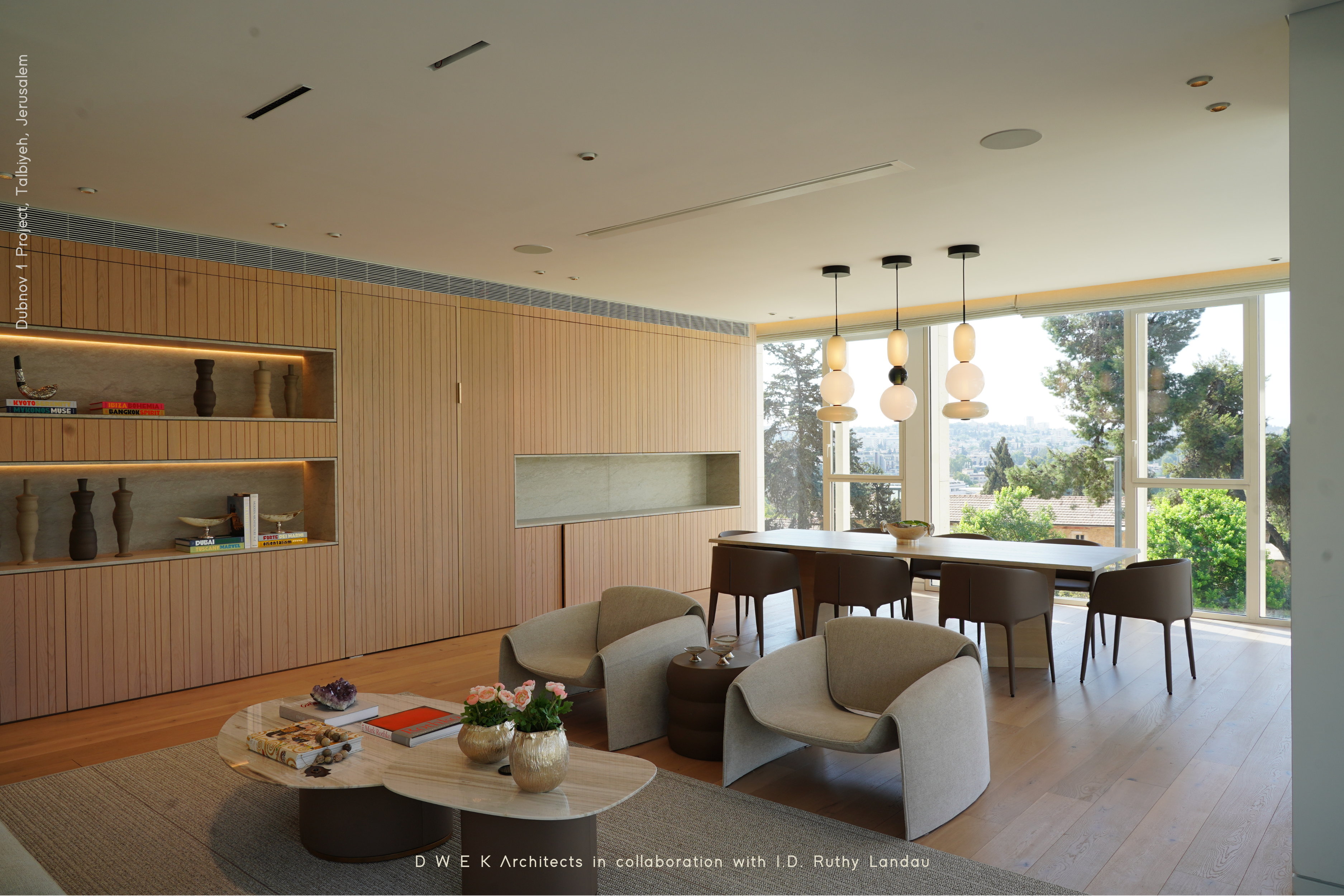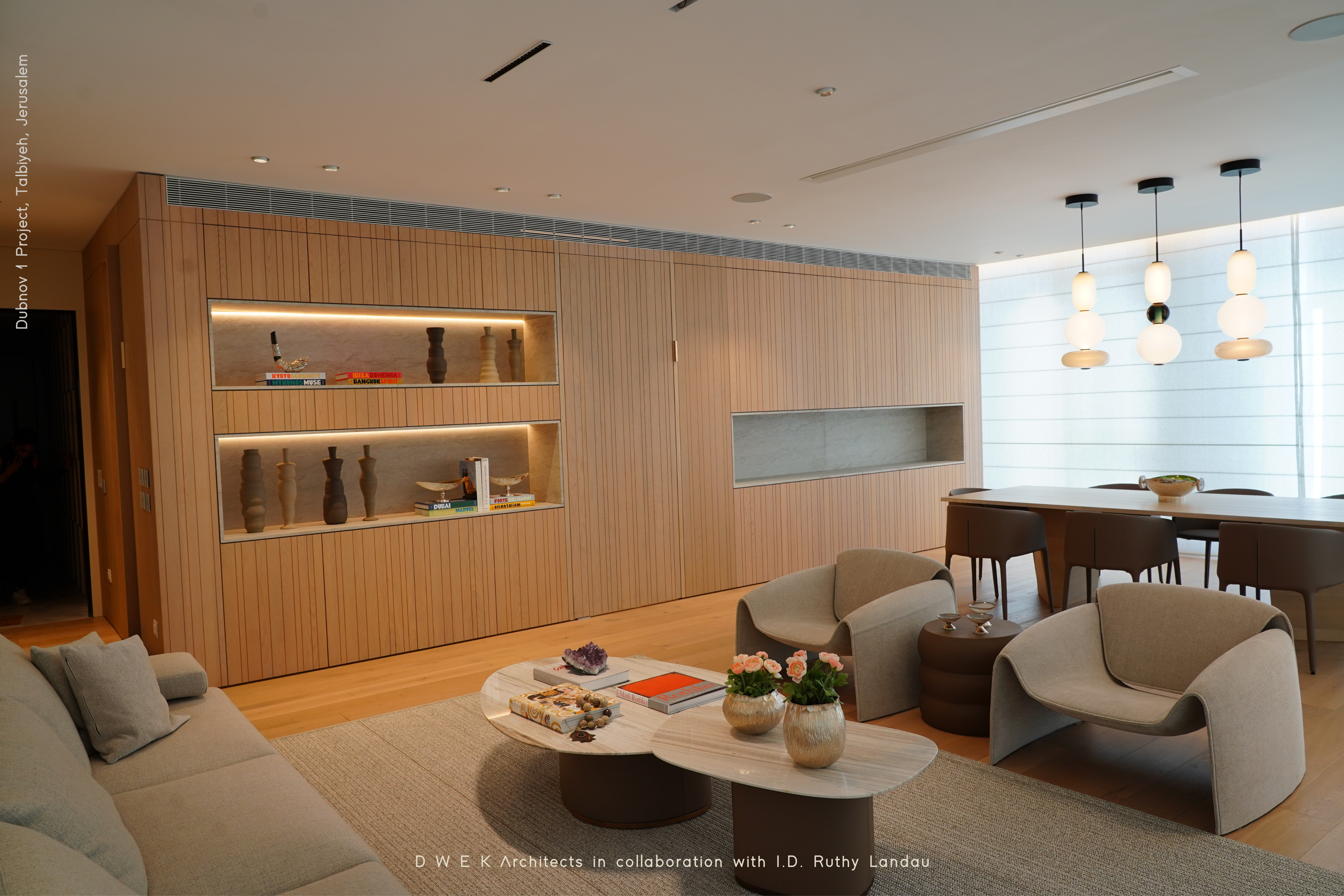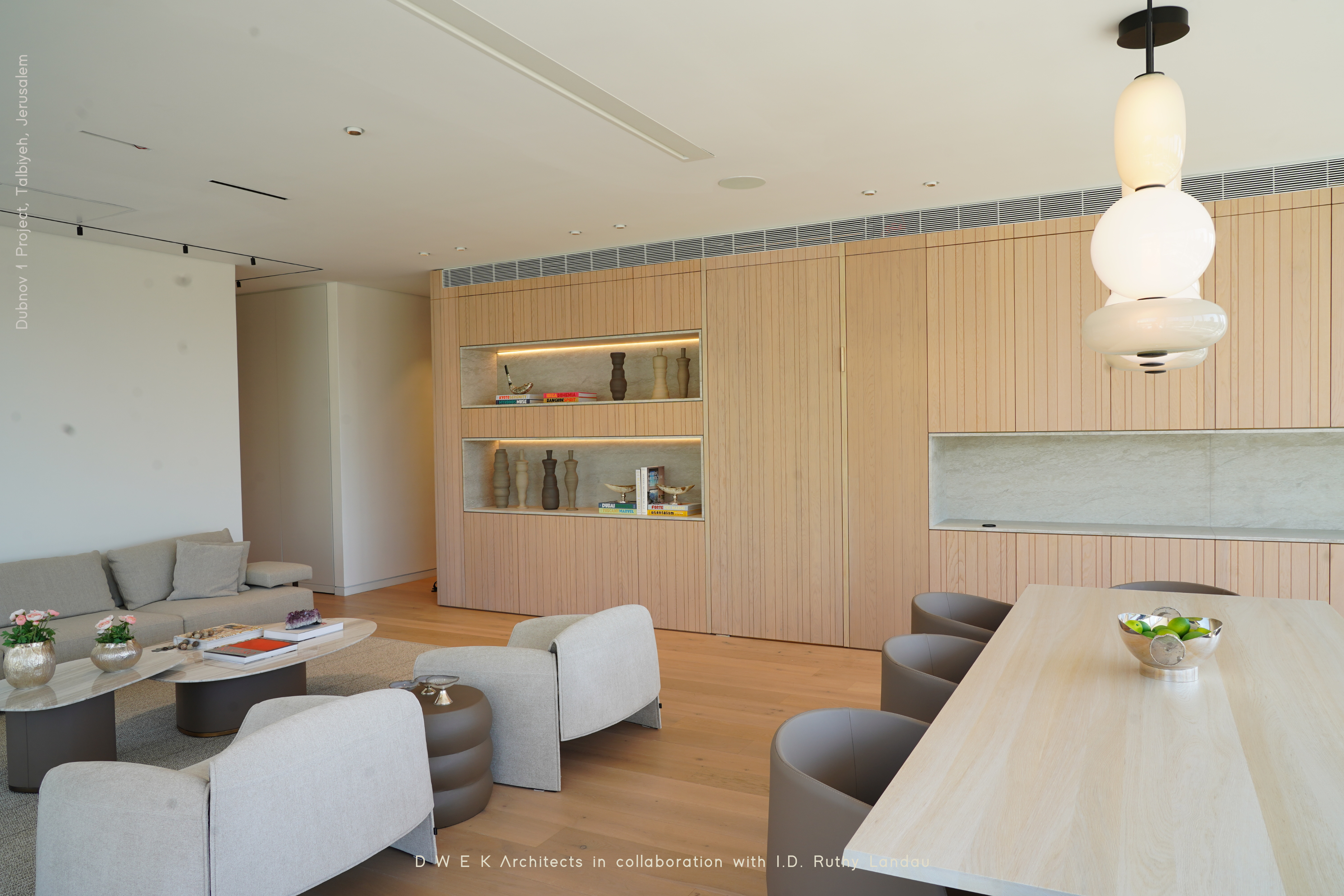 Dwek Architects, together with I.D. Ruthy Landau, whose interior design leadership shaped the palette, spatial flow, and detailing, delivered an end-to-end scope aligned with the building’s architecture and open-space ethos: flowing, light-filled rooms, natural materials, and precise carpentry, all with careful attention to daylight, ventilation, and durable low-impact finishes. Conceived and realized as a single, joint creation by Dwek Architects and I.D. Ruthy Landau.