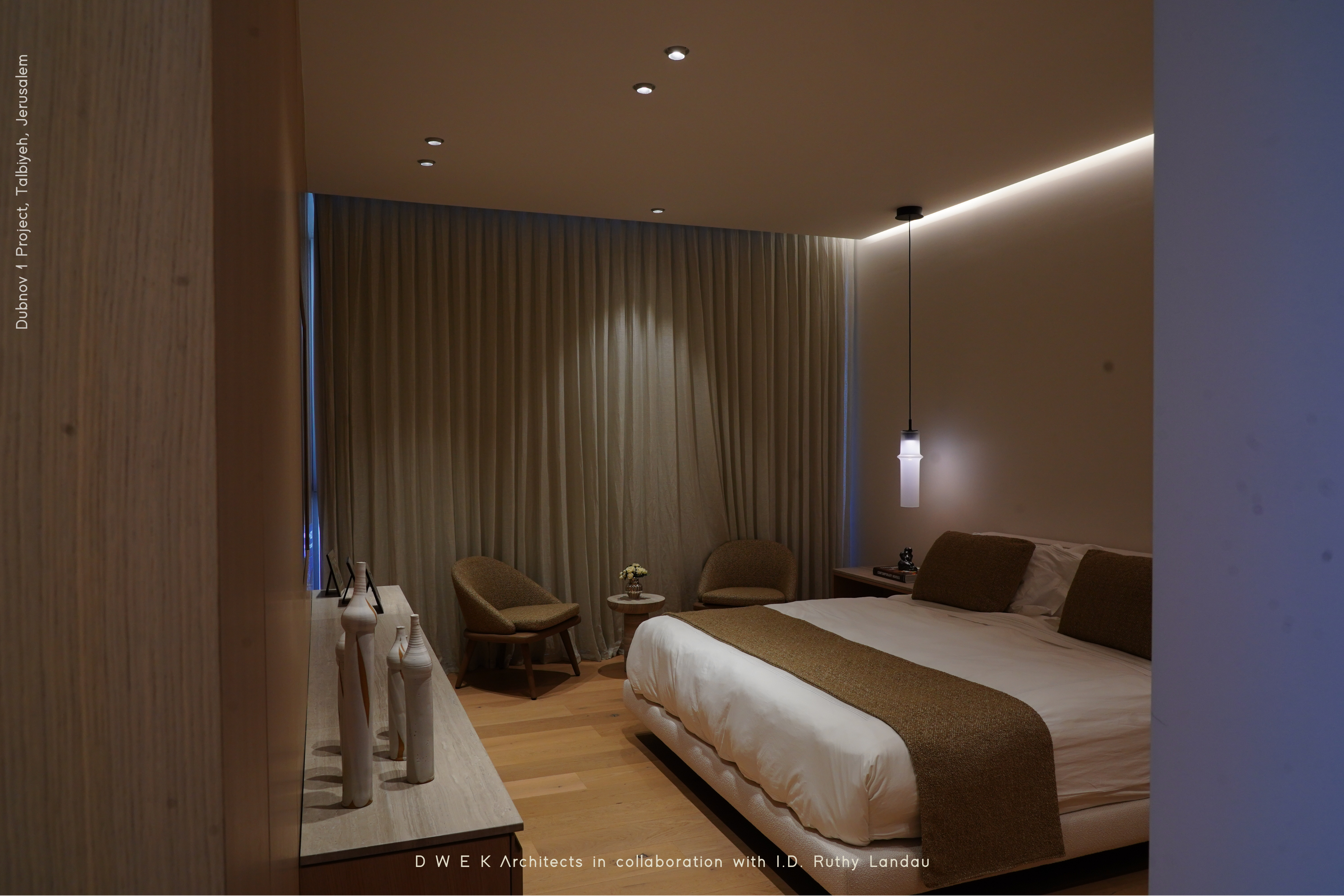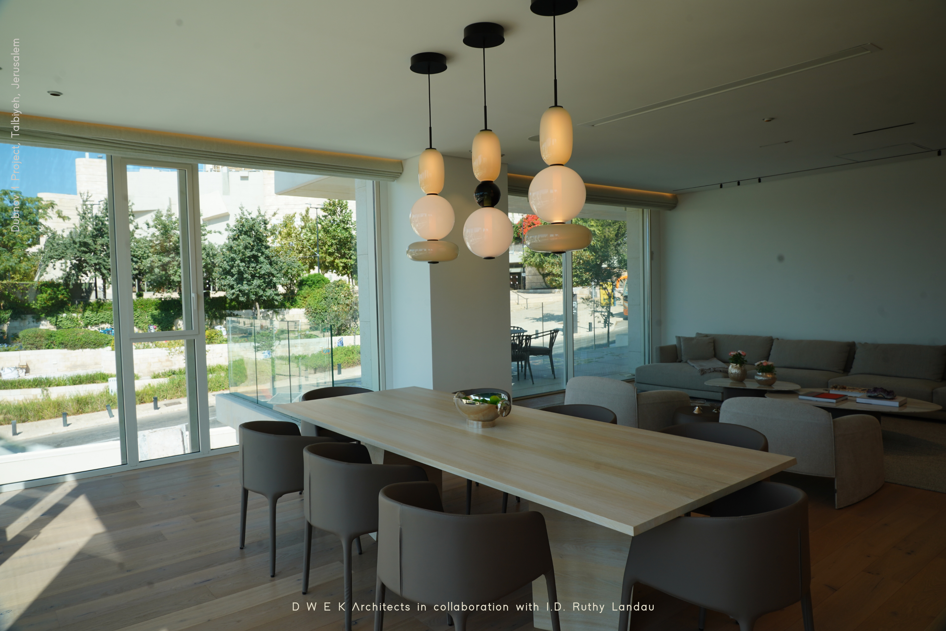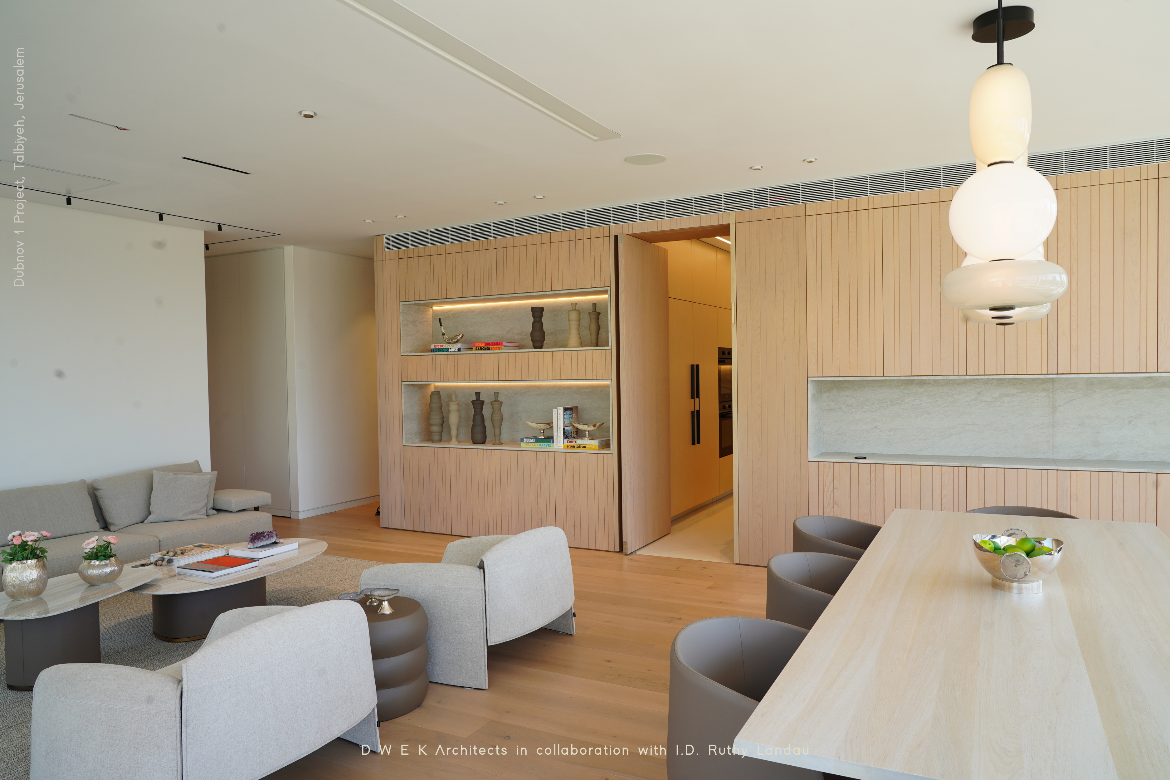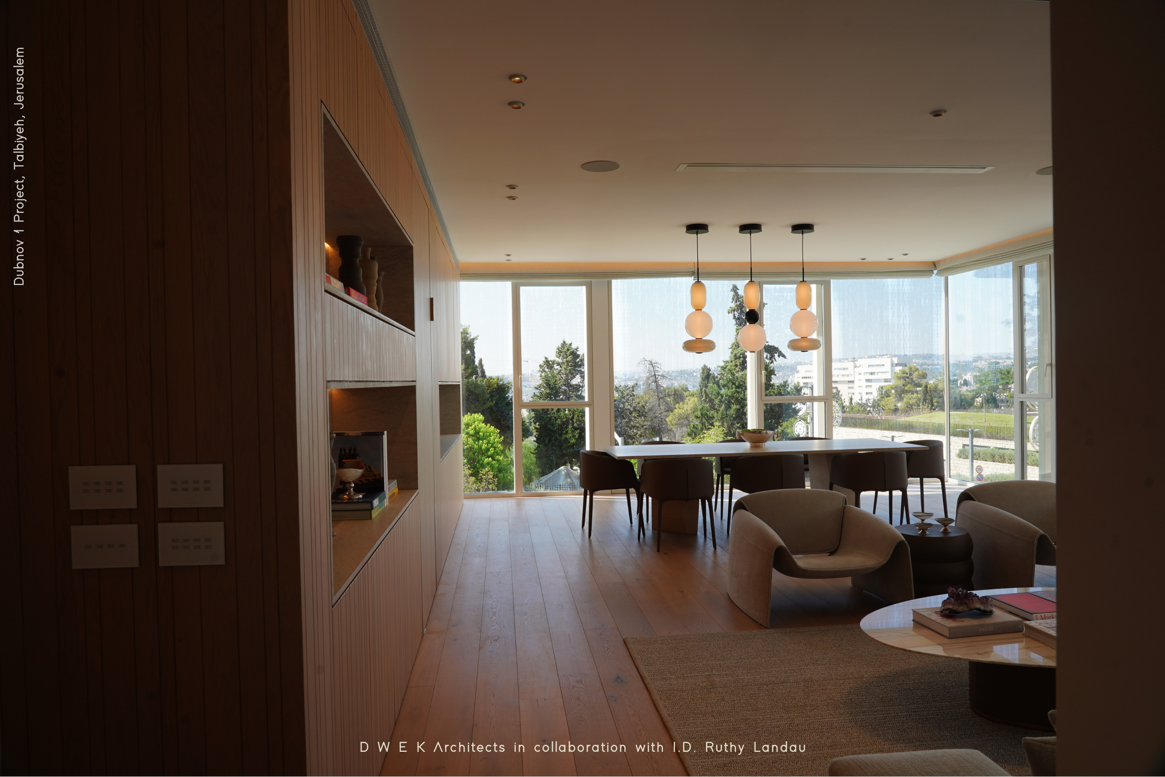 Dwek Architects, together with I.D. Ruthy Landau, whose interior design leadership shaped the palette, spatial flow, and detailing, delivered an end-to-end scope aligned with the building’s architecture and open-space ethos: flowing, light-filled rooms, natural materials, and precise carpentry, all with careful attention to daylight, ventilation, and durable low-impact finishes. Conceived and realized as a single, joint creation by Dwek Architects and I.D. Ruthy Landau.